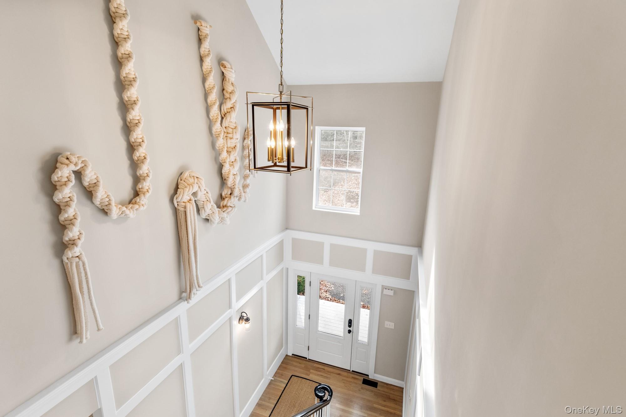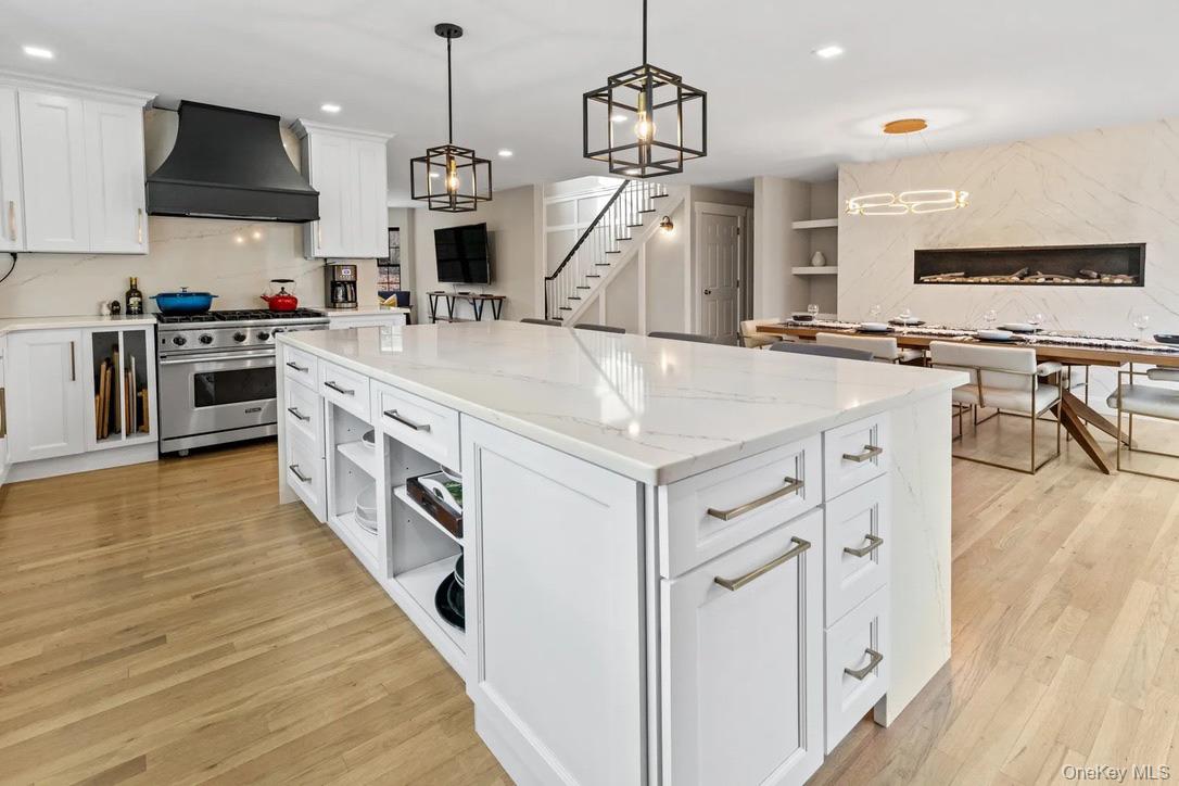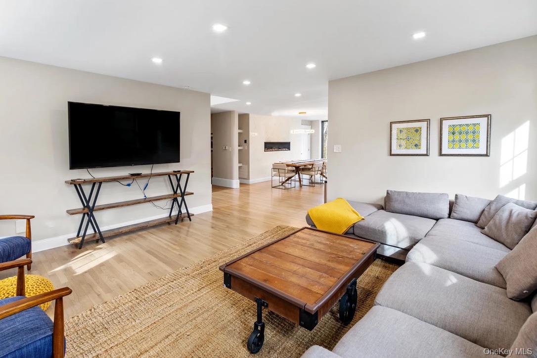 Upon entering, one is greeted by impressive high ceilings, elegant paneling, and expansive hardwood floors. To the right, a sunlit den, illuminated by large windows and bright recessed lighting, provides a warm and inviting atmosphere. The eat-in kitchen is adorned with stunning marbled countertops and equipped with top-of-the-line Viking appliances. The dining area is enhanced by a wall-integrated fireplace which serves as a sophisticated backdrop for dinner gatherings.