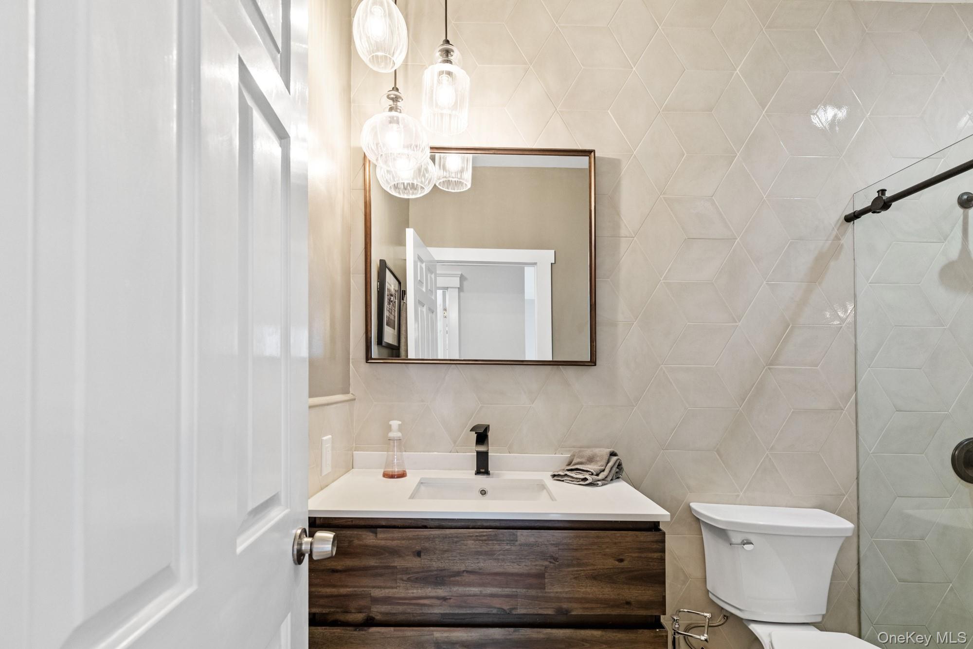 The fully finished lower level is ideally suited for entertaining and provides ample space for a workout area, dining room, lounge with a bar, as well as the versatility to adapt the space to meet individual preferences. The backyard features a sunlit deck and patio, an in-ground saltwater pool, and a fire pit, creating an idyllic environment for outdoor entertaining.