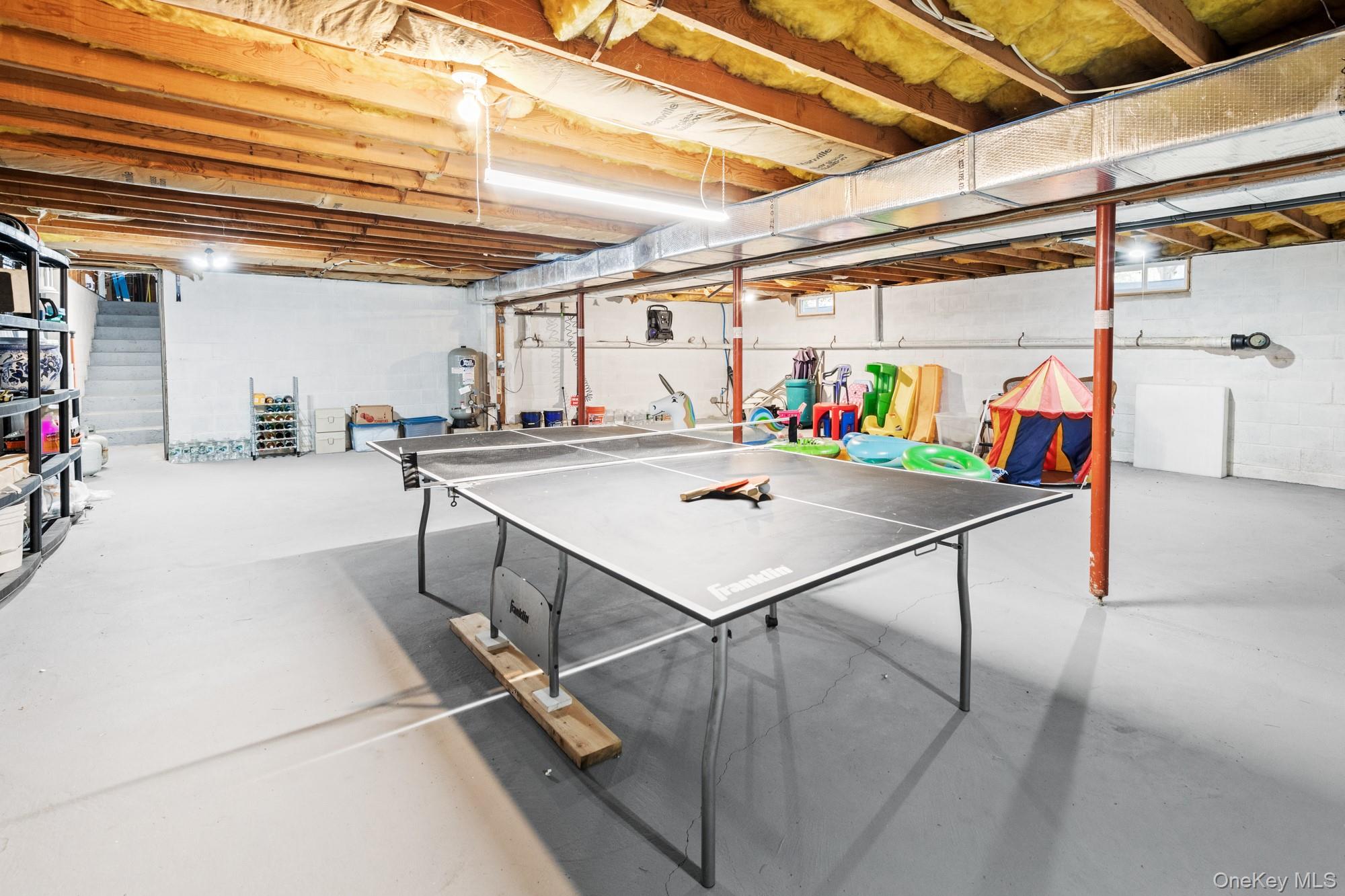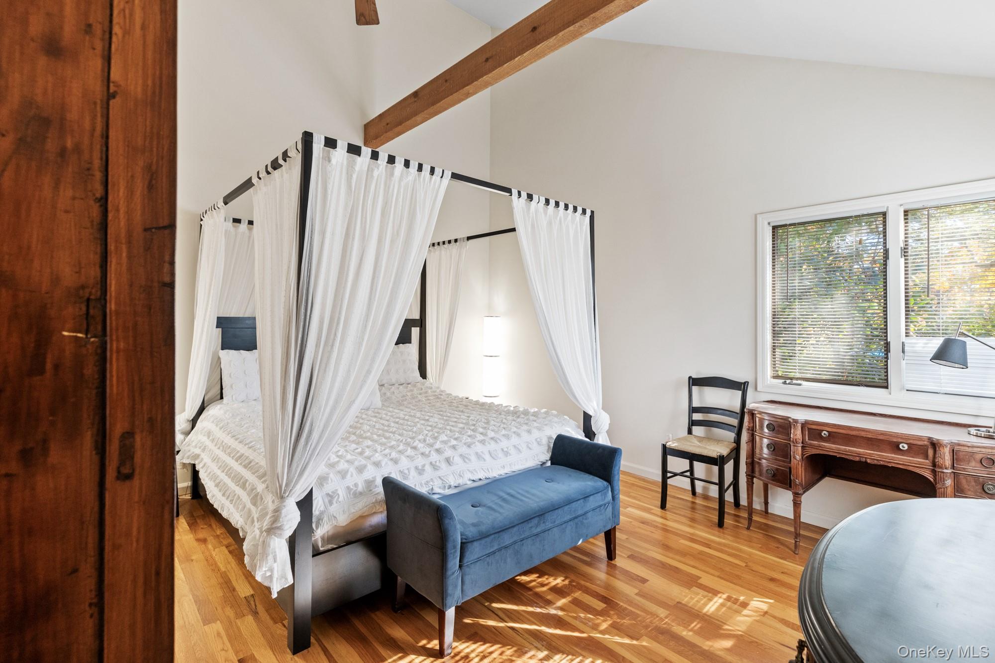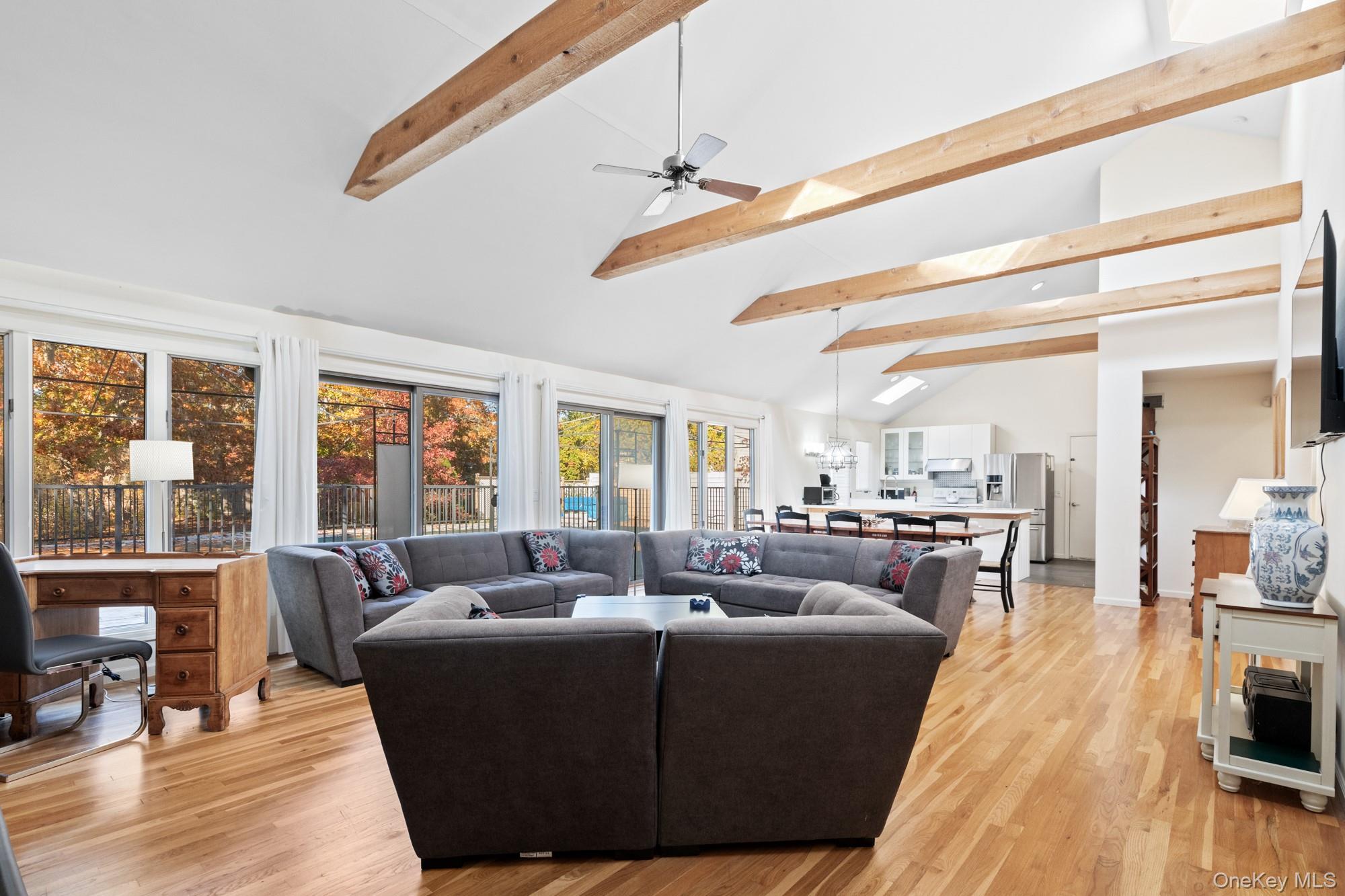 Located at the end of a quiet cul-de-sac, this 4-bedroom, 3-bath home offers one-level living on a private, park-like acre. A 200-foot driveway leads to an open, airy floor plan with 18-foot ceilings and a striking stone fireplace. Glass sliders open to a large deck, heated in-ground pool, and hot tub--ideal for indoor-outdoor entertaining.